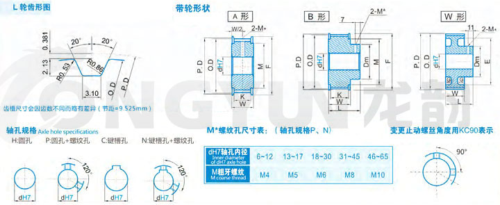 加工L同步帶輪所用材質以45#鋼、鋁合金為主、其它還可選用鑄鐵、銅、尼龍等其它適合加工的材料,如有需要也可以按照您所需的材料加工。L型同步帶輪表麵處理有本色氧化,發黑,鍍鋅,鍍彩鋅,高頻淬火等處理。精度等級依客戶要求而定。