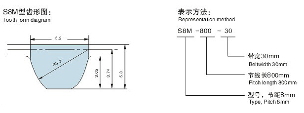 三個部分:指示帶的長度,間距和寬度帶回來的部分號碼。如下圖所示。此S8M橡膠單麵齒同步帶型號,節線長為800mm,帶寬為30mm。